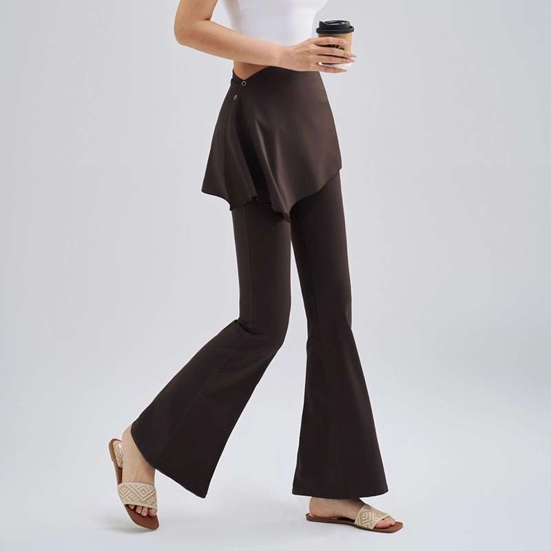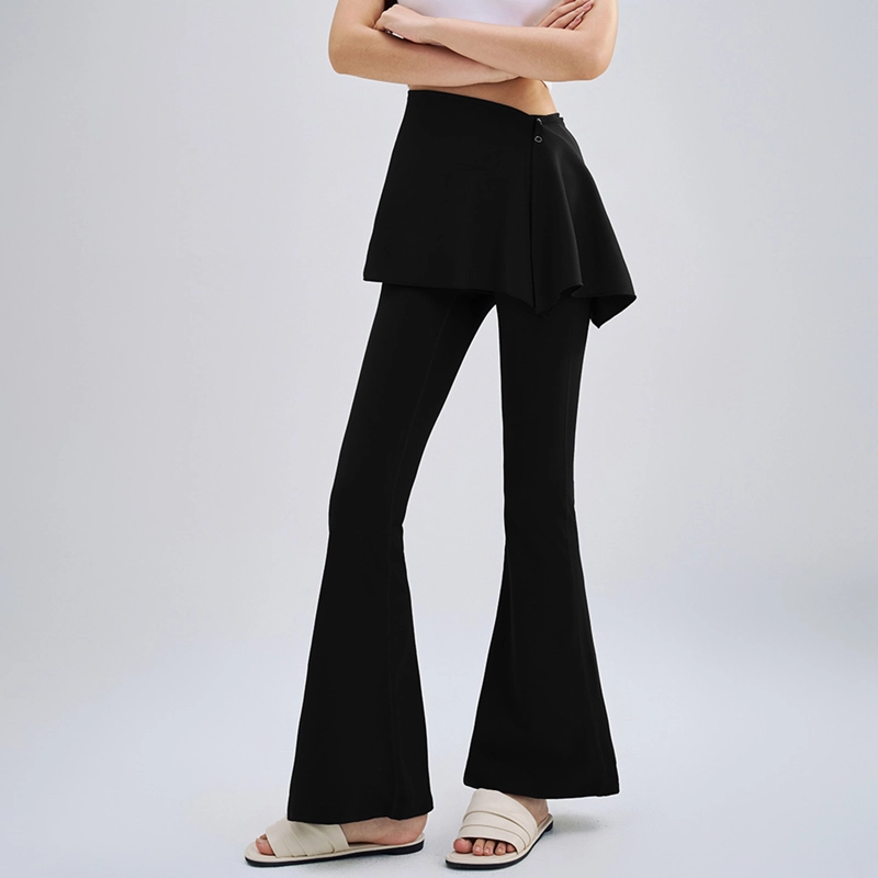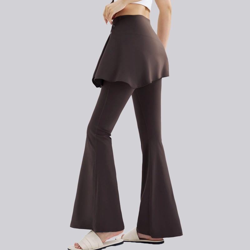 These innovative flare pants feature a built-in skirt layer for hip coverage. The thin, high-waist design is perfect for summer, offering a stylish flared look for yoga and outdoor fitness activities.