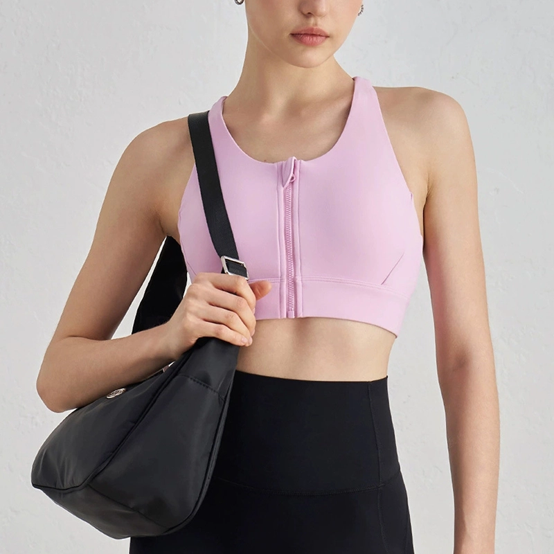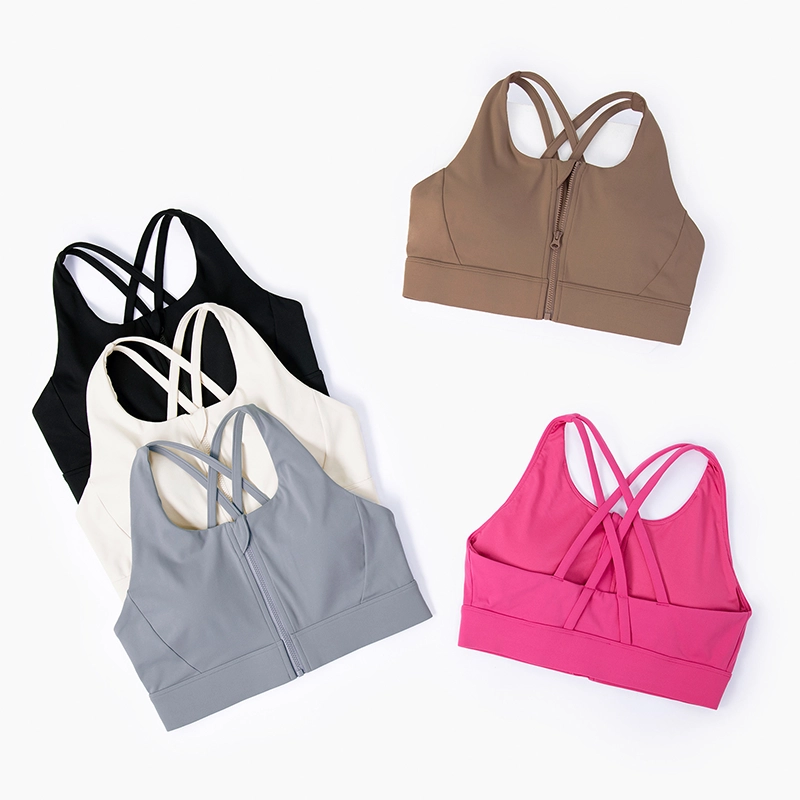 This front-zip gym wear bra features a cross-back design with built-in support for shock absorption and stability during running, gym workouts, yoga, and outdoor fitness. Breathable, quick-dry fabric ensures comfort, while the sleek design adds a premium look. Ideal for activewear collections and OEM/ODM customization.