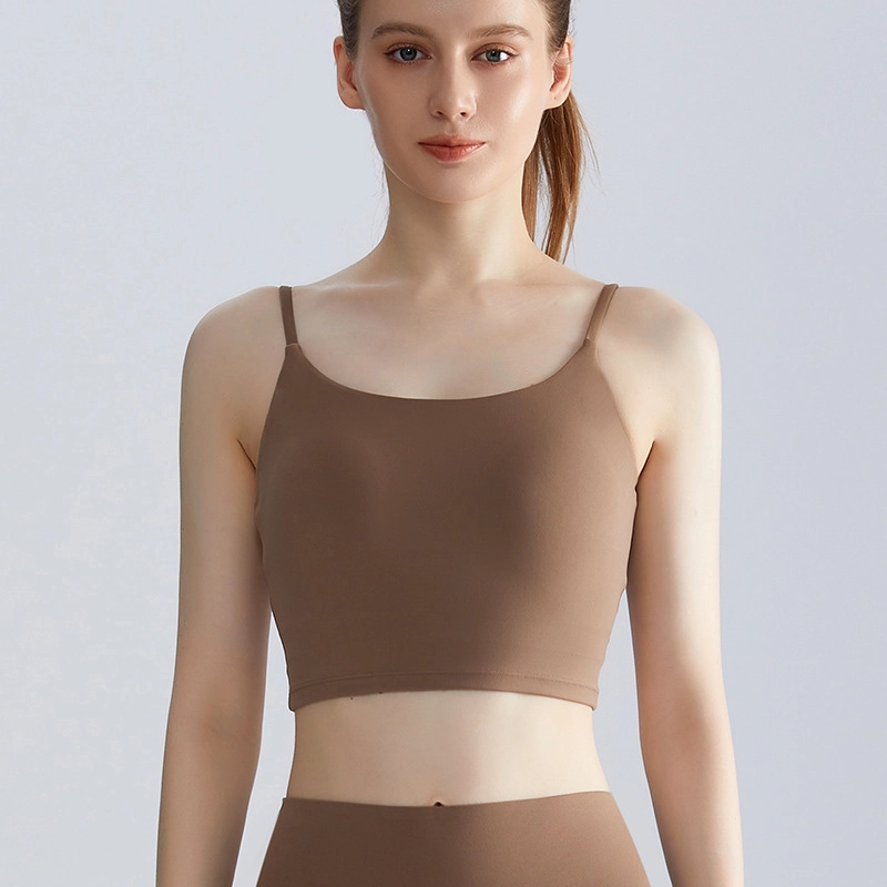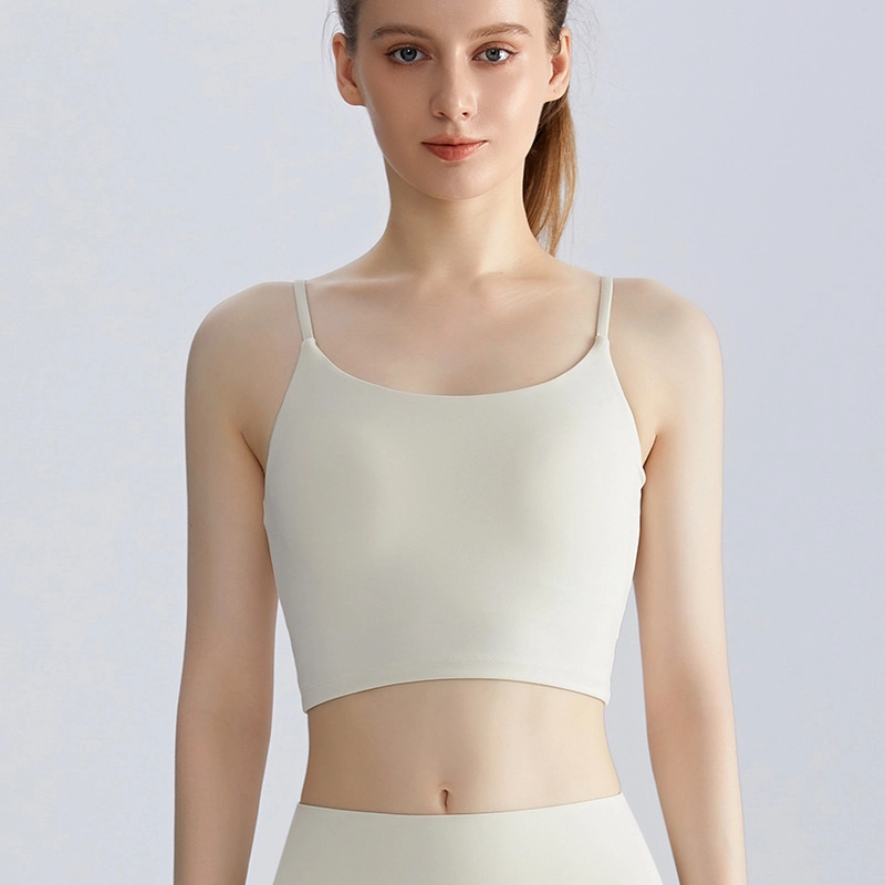 This strappy activewear tank features a one-piece design with built-in pads for secure, shock-absorbing support. The slim straps and open-back silhouette provide breathability and freedom of movement, making it perfect for yoga, pilates, running, and everyday activewear. Ideal for brands seeking customizable, high-quality sports tops.