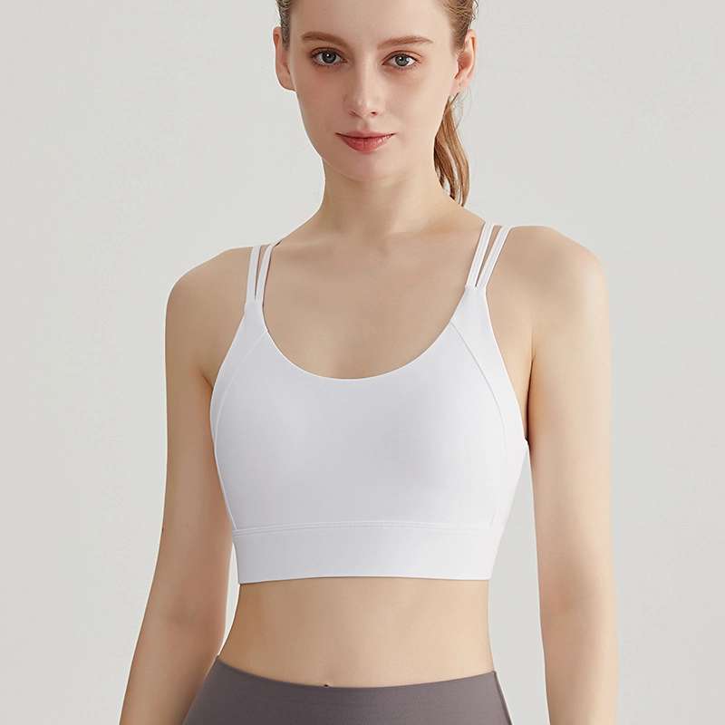 Featuring thin straps and a stylish cross-back design, this yoga sports bra delivers both elegance and support. The fixed cups provide a natural lift and secure fit, making it suitable for yoga, workouts, or casual wear.
